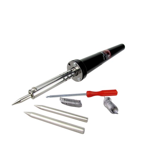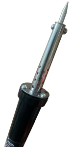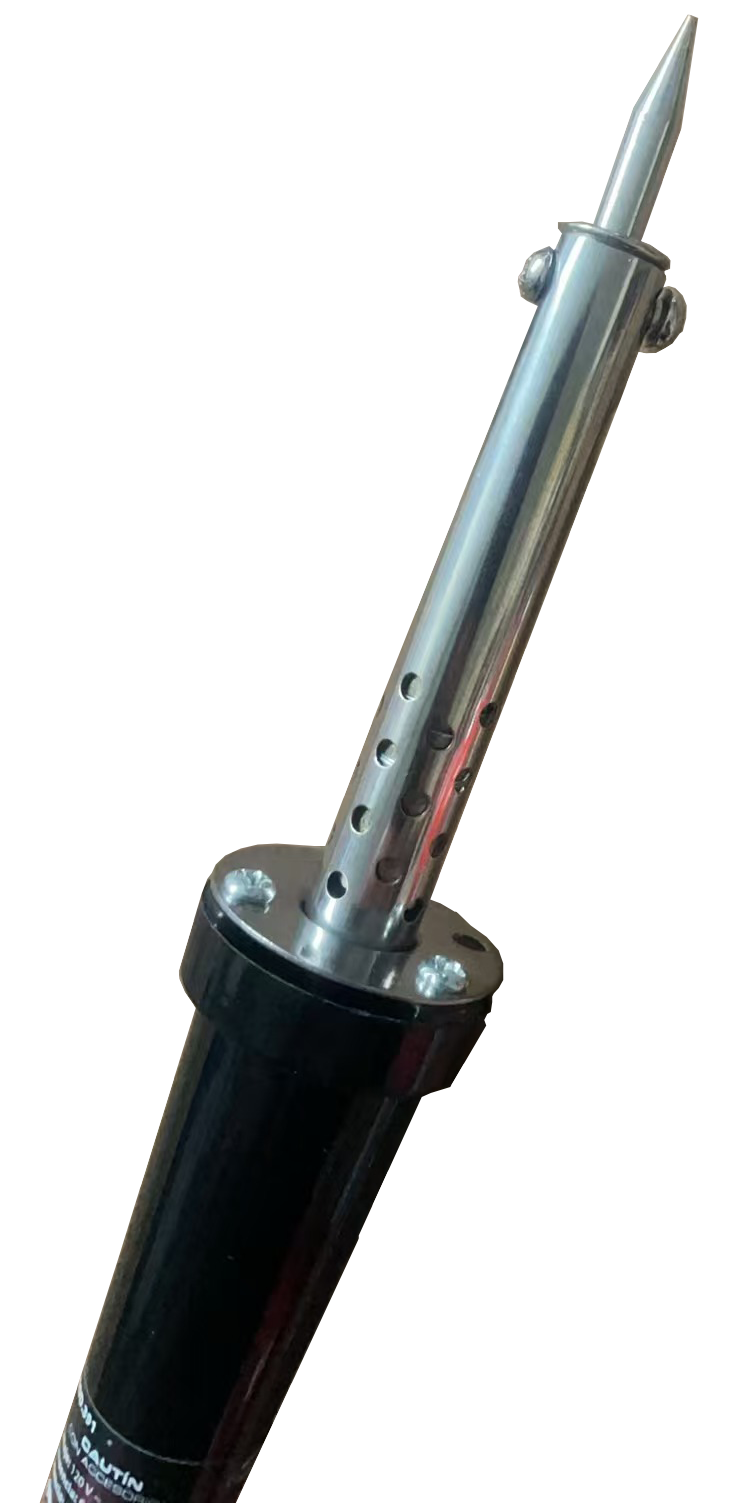 Cautín tipo lápiz de 45W/120V para soldar y reparar componentes electrónicos delicados. Diseño con punta fina y base de cobre para soldaduras precisas y eficientes, ideal para profesionales y aficionados que buscan una herramienta confiable y precisa. Útil en reparaciones y proyectos escolares.