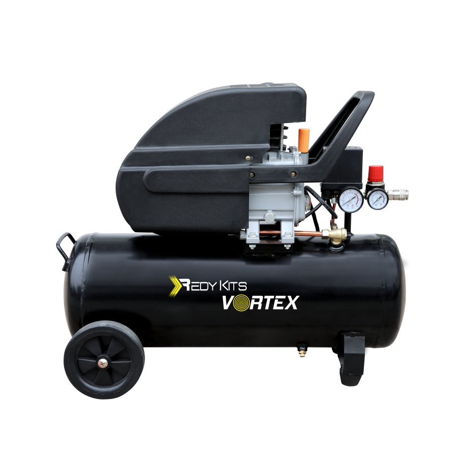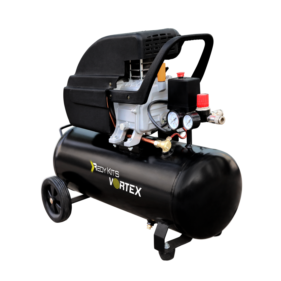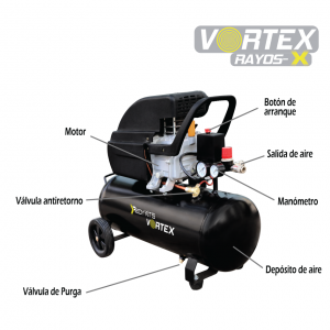Compresor lubricado por aceite SAE 40, con un tanque de 30 lts., útil para labores que no demanden demasiado volumen de aire, tiene dos salidas de aire, pero sólo una de ellas es regulable, la otra es una salida directa. Gracias a su tamaño es ideal para rápidas reparaciones además que es de fácil transportación.