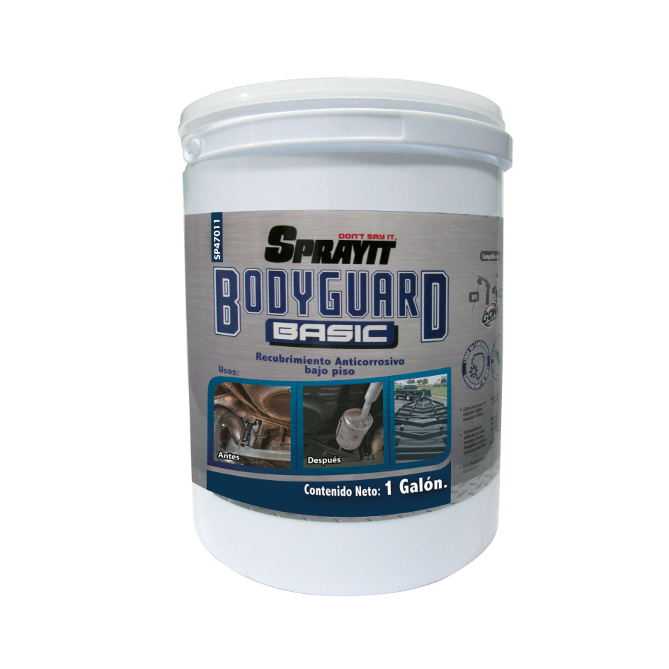 BodyGuard de Sprayit es un recubrimientoprotector anticorrosivo y estético. listo para aplicar en materiales como chasises automotrices, herrería, cartón, plástico entre otros. BODYGUARD BASIC de Sprayit provee un secado al tacto en sólo 45 minutos, logrando una apariencia uniforme y acabado original, no se agrieta garantizado una excelente protección. BODYGUARD puede aplicarse con las pistolas especializadas Modelo 303 y 33012 de Goni. 1 Galón cubre 4 a 8 m2.