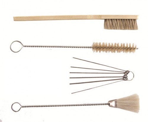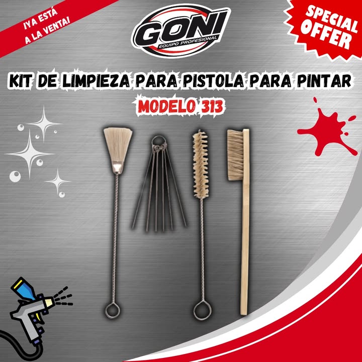 Kit de accesorios diseñados para la limpieza de las pistolas para pintar, cualquiera que sea la forma de alimentación de la pistola. Incluye varias varillas de diferentes medidas para limpieza de los ductos tanto de aire como de material.