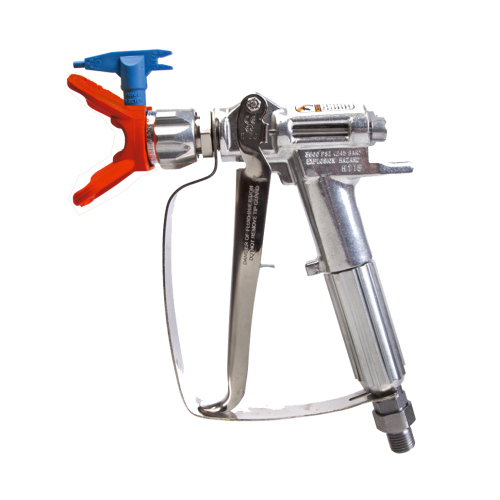 Pistola para equipo airless, fabricada en aluminio, diseñada especialmente para soportar las altas presiones de funcionamiento que tiene el equipo.