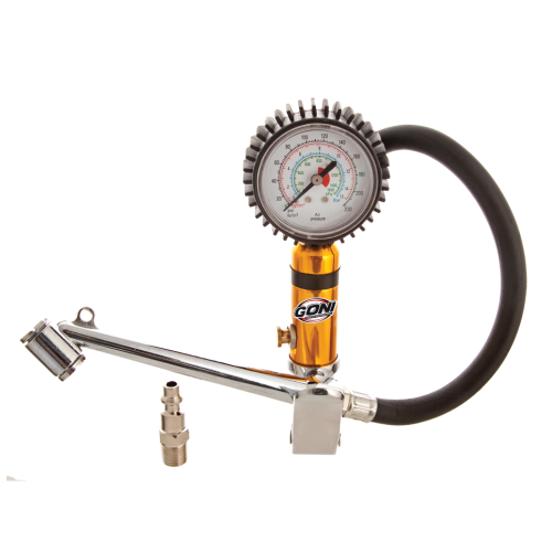 Novedoso calibrador de llantas que se inflen con aire, permite visualizar por medio del manómetro la presión exacta que se requiere para tener un buen rodamiento de la llanta, el calibrador tiene la característica de poder emplear las dos partes de la cabeza. Cuenta también con una válvula de drenado para liberar el aire que se queda en el interior después de realizada una lectura.