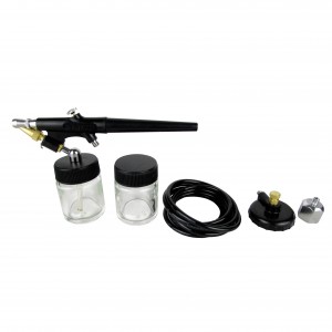 Útil y práctico aerógrafo que gracias a sus vasos independientes permite realizar cambios de color rápidamente y gracias al sistema que emplea puede inmediatamente utilizarse sin necesidad de lavarse, además si se quiere se puede utilizar este equipo con latas de aire comprimido ya que dentro de los accesorios incluye una tapa diseñada especialmente para tal uso.