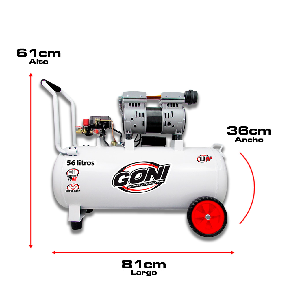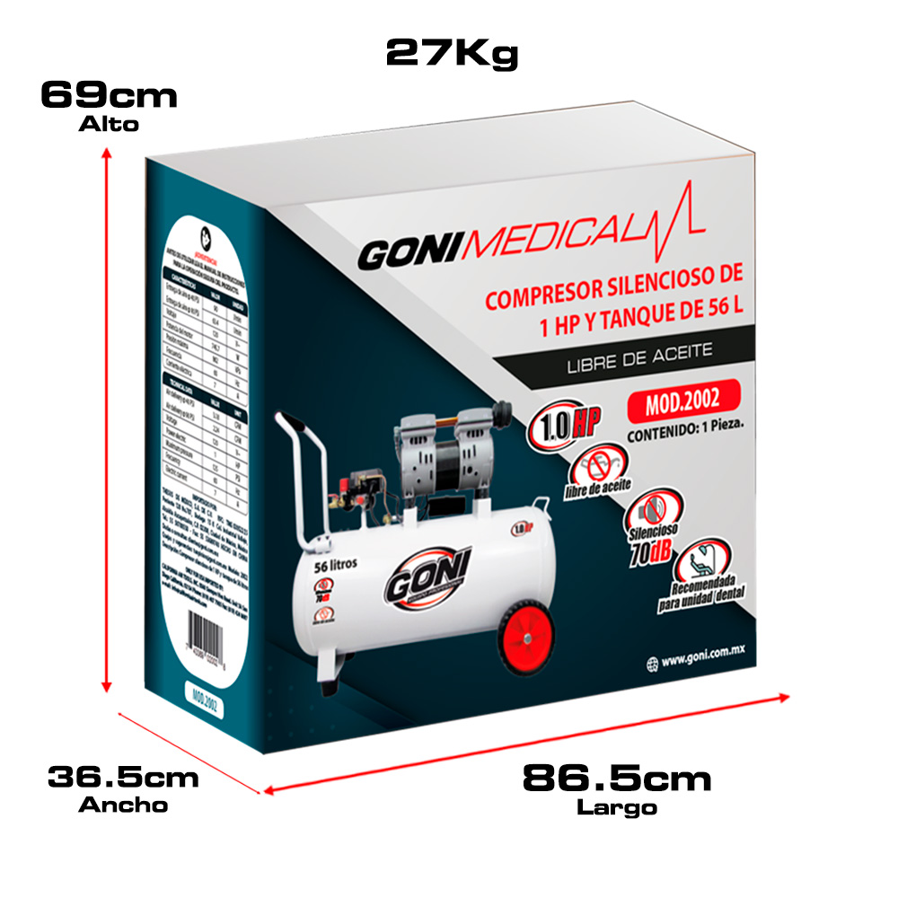 Compresor silencioso de 1HP, con capacidad de tanque de 56 litros, ideal y recomendado para uso médico y dental, por sus siguientes ventajas: